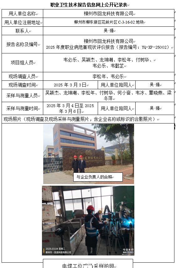 柳州市回龍科技有限公司 2025年度職業(yè)病危害現(xiàn)狀評價報告